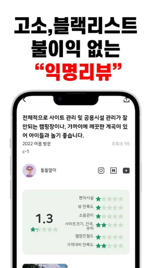 개인정보는 저장하지 않고, 저장하는 정보는 암호화하고 나눠서 저장해 누가 작성했는지 찾을 수 없습니다! 캠핑장으로부터 고소 걱정없이 맘편히 리뷰 작성해요!