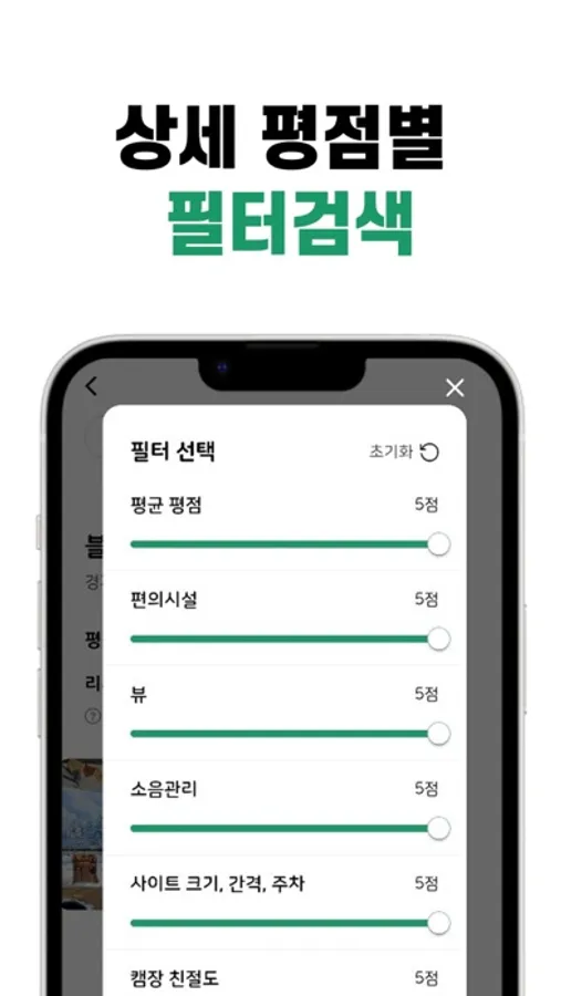 캠핑장 별 평균평점 혹은 편의시설, 소음관리, 사이트, 뷰, 가성비, 친절도 각각에 대한 평점별로 필터 검색이 가능해요! 내가 매너타임을 중시하는 캠퍼라면 소음관리 4-5점 캠핑장만 따로 찾아 볼 수 있어요!