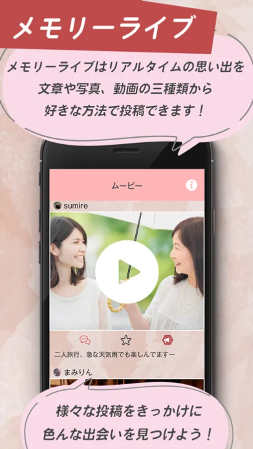 リアルタイムで思い出(メモリー)を写真、動画、音声の三種類から好きな方法で投稿できます!