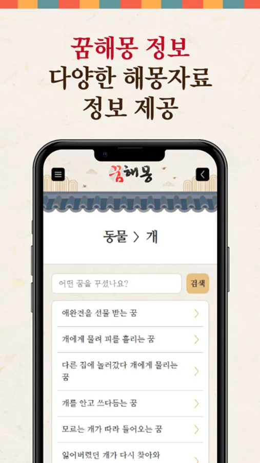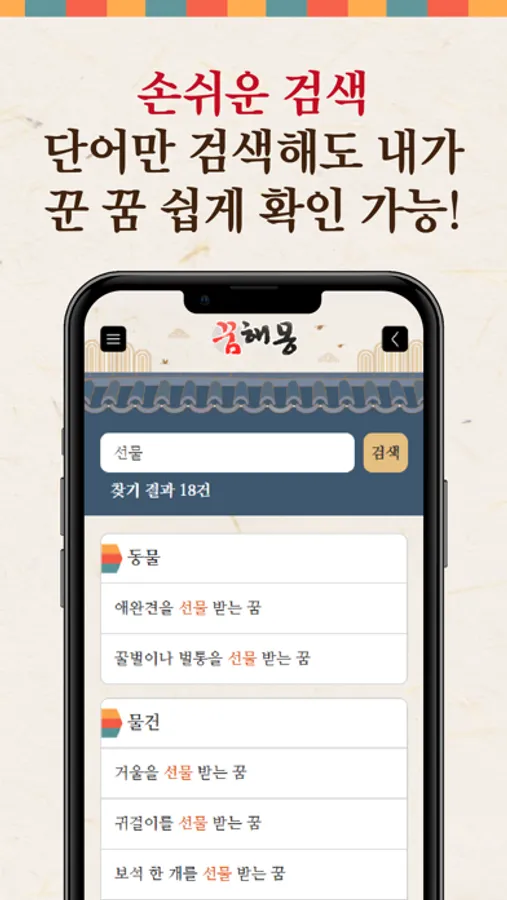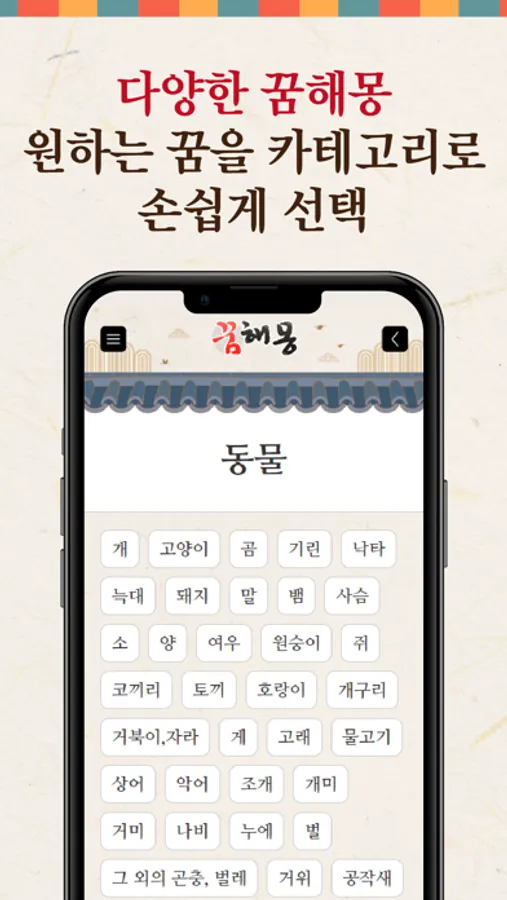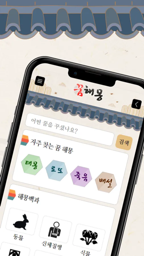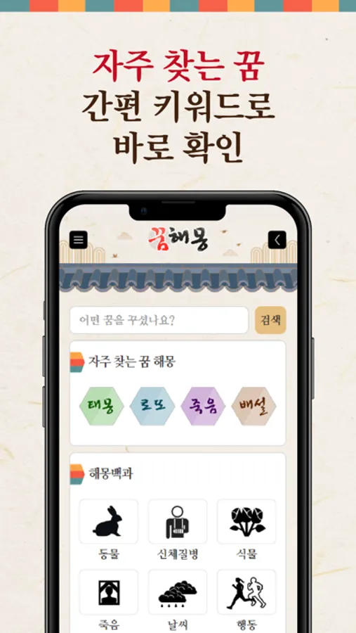 동물/신체/질병/식물/죽음/날씨/행동/음식/자연/장소/인물/물건 등 다양한 카테고리의 꿈을 확인하고 더 정확한 꿈 해몽을 도와드리기 위해 상세한 키워드까지 제공하고 있습니다. 꿈에 대한 정보를 완벽하게 분석하고 정리했습니다.