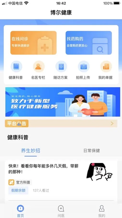 博尔健康用户版为用户提供线上问诊,购药,复诊的健康管理模式,通过“互联网+新医疗+新医药”建立与医生的联系。
