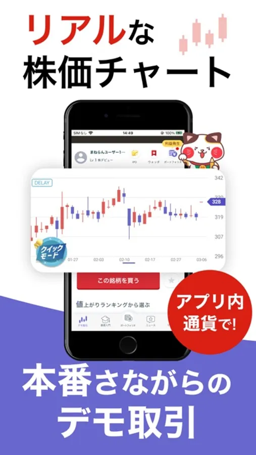 アプリ内通貨を使って、実際の株価チャートをもとに株式投資のデモ取引を体験できます。