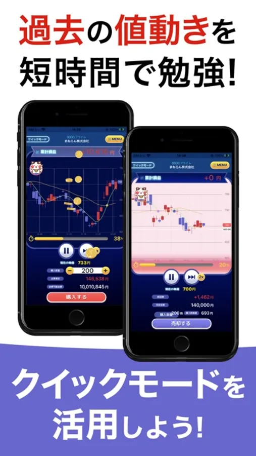 実際にあった過去の株価の値動きをスピード体験・取引できるクイックモードを搭載。