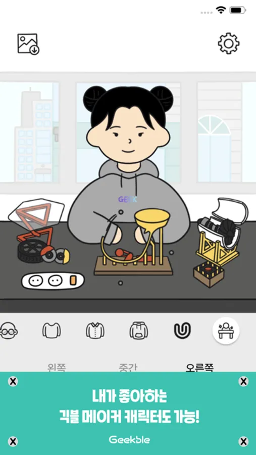 책상 앞에 앉아있는 내 모습뿐만 아니라 특별 카테고리로 좋아하는 긱블 메이커의 캐릭터를 직접 만들어보세요.