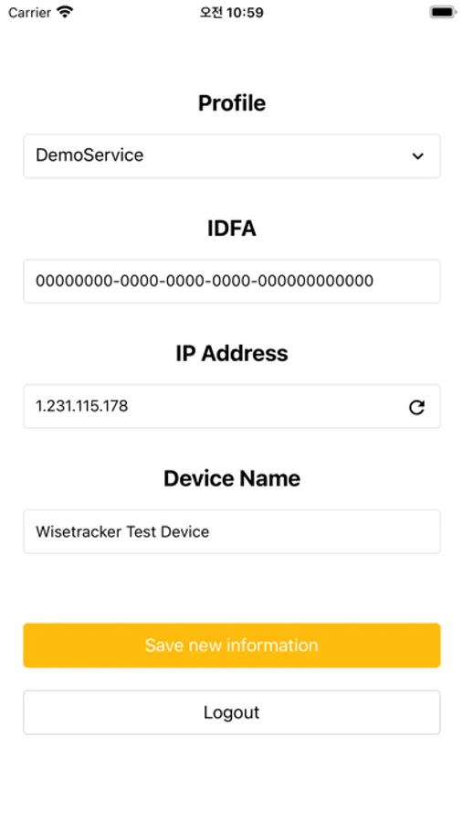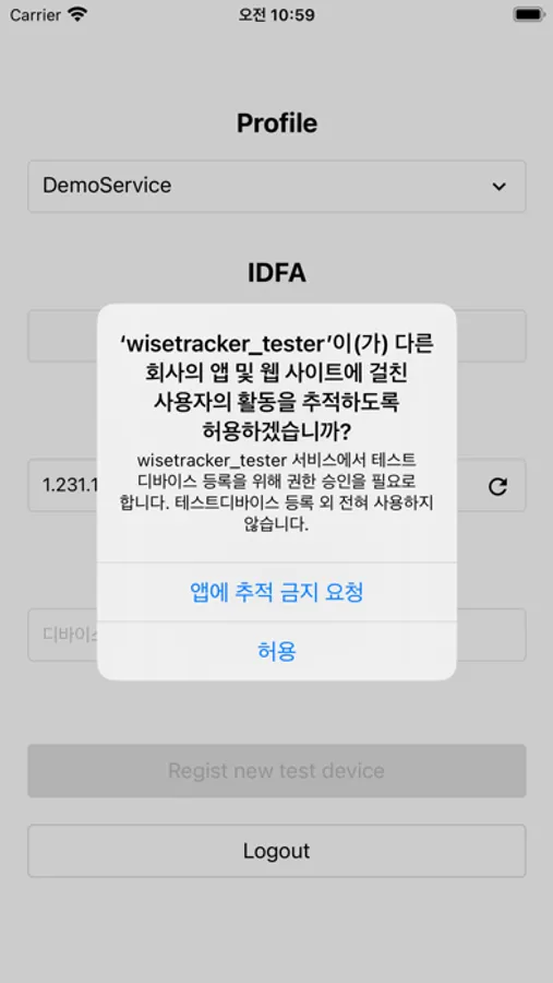 와이즈트래커 데이터 검증을 위한 테스트 디바이스 등록 지원 어플리케이션입니다.