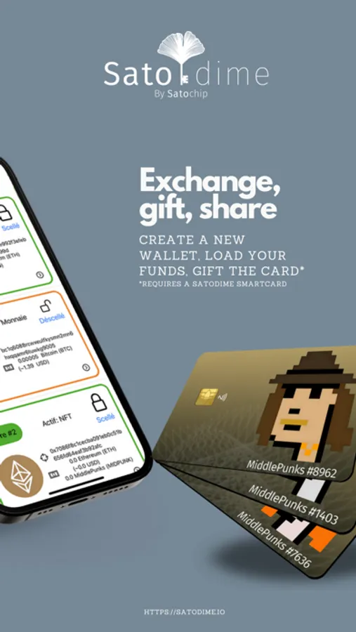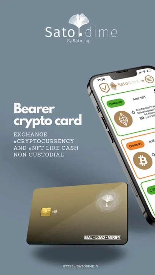 Satodime is the easiest and fastest way to protect your crypto-currencies or other cryptographic assets on cold storage. In a few clicks, create up to 3 wallets per card to store your favorite tokens. Exchange your crypto-currencies and NFTs as you would a bank bill without the need for a trusted third party, off-chain. Your wallet's private keys are stored and sealed in the chip's secure memory offering added security.