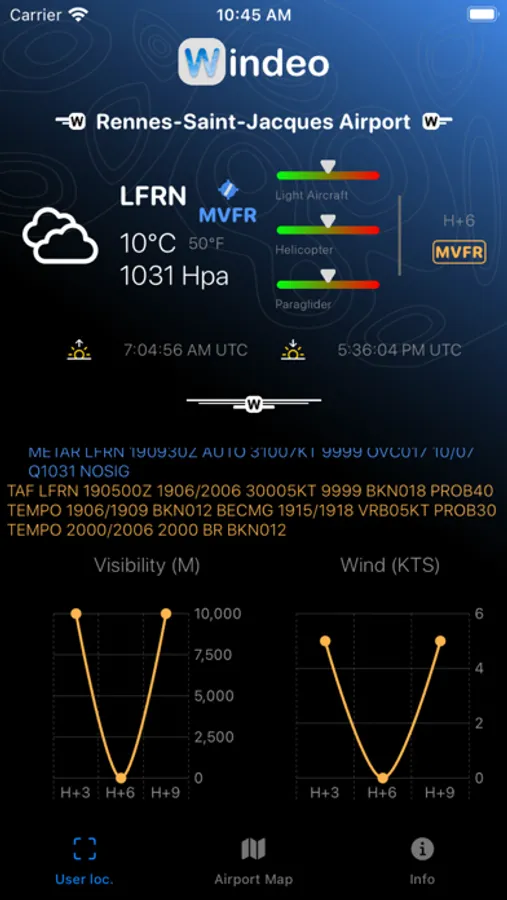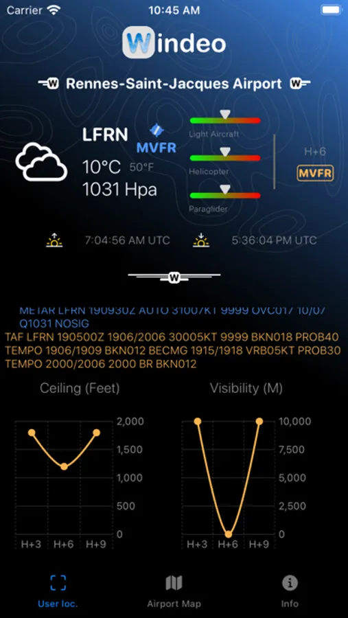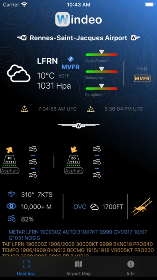 Pilots and airport operators, switch between multiple data sources to get a better handle on your observation and forecast. Choose between the nearest airport or an airport of your choice, Windeo gives access to the observation and weather forecast for your favorite airfield. Windeo provides also an accurate status of landing strips by runway third, according to an algorithm based on artificial intelligence, and indicates a flight safety indicator by aircraft type. Now also for the Apple Watch !