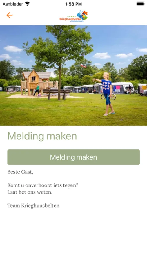 In een wereld waar iedereen als een sneltrein door het leven gaat, gaan wij juist op zoek naar dat heerlijke rustmomentje. Wij willen voor onze gasten een moment creëren om echt te genieten van de vrijheid, de gezelligheid én van elkaar. Het ultieme vakantiegevoel ervaren met het hele gezin. Dankzij onze app kunt u nu nog gemakkelijker alle informatie vinden tijdens uw bedrijf. Zo bieden wij een overzicht van onze faciliteiten, evenementen en wat er te beleven valt in de omgeving.