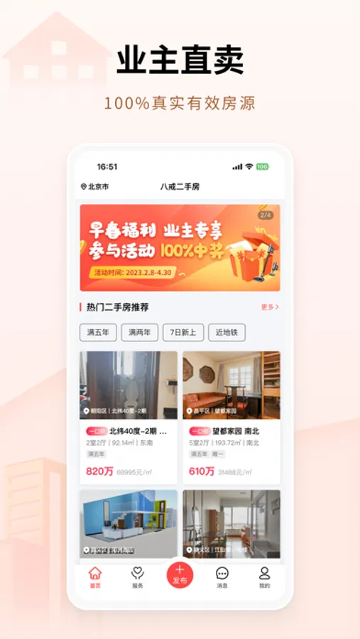 八戒二手房是一个免费的二手房交易平台,服务于买房卖房人,平台都是业主真房源, 买卖租赁都0中介费,租客房东直接聊,买房卖房直接聊,买卖有专业人员全流程提供服务,更安全更透明更自由!平台对业主推出了免费的帮业主过滤优质买家的服务、交易服务、免费的合同服务、免费的过户服务,让业主能和优质的买家直接联系;