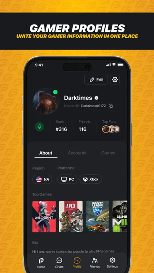 Once you've found your perfect LFG, kick off your team and go for the win. And while you're waiting for the match to start, PlayerFinder offers in-app chat with your squad, so you can stay connected and strategize together. You can also easily see your squad's gaming and social links so that you can connect with them in-game and out of the app.