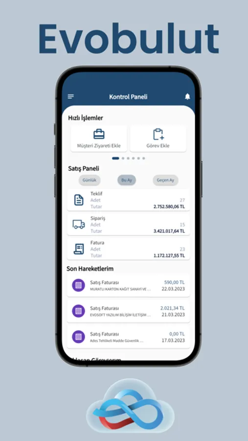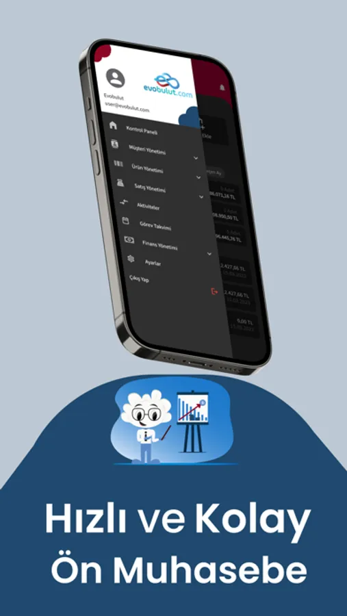 Bulut Tabanlı Ön Muhasebe ve Satış Yönetim programı olan Evobulut’un mobil uygulaması ile bilginin gücü her an elinizin altında! İnternet bağlantısı olan her cihazdan kullanıcı bilgilerinizi girerek Evobulut'un mobil uygulamasını kullanabilir ve dilediğiniz yerden firmanızdaki tüm süreçlerin yönetimini sağlayabilirsiniz.