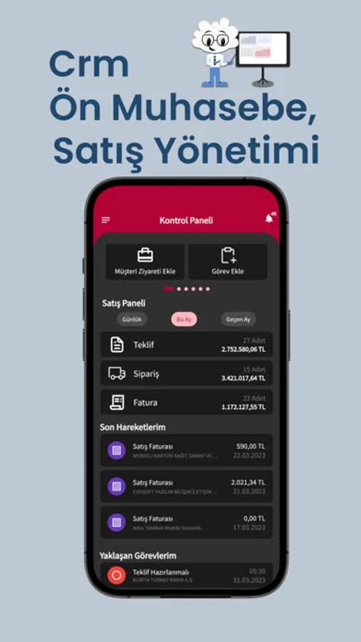 Firmanızın Crm, Ön Muhasebe, Teklif, Sipariş, Fatura, Finans yönetimi süreçlerini çözmek için ihtiyacınız olan tüm özellikler bu uygulamada!