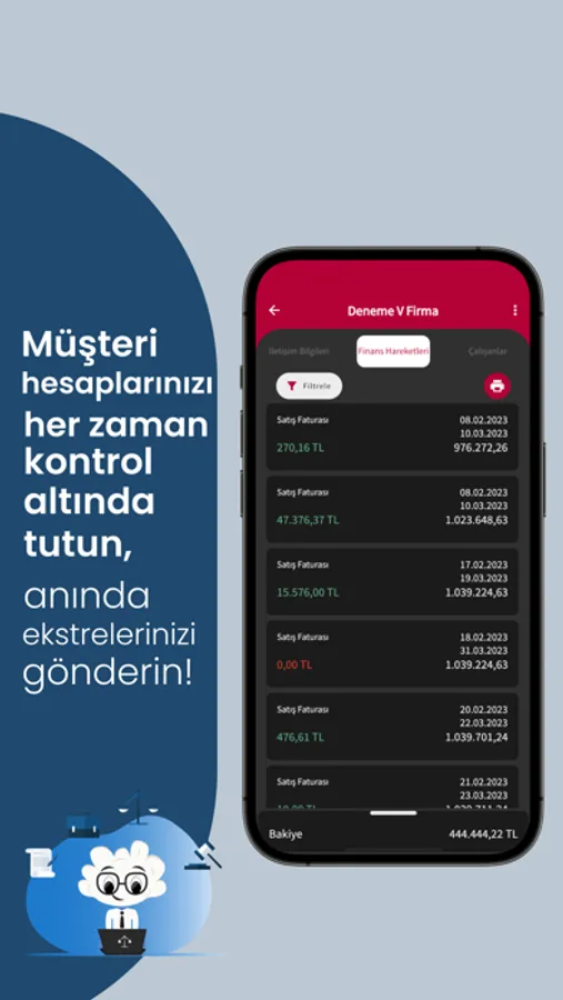 - Müşteri ekstrelerinizi tek tuş ile mail atabilir veya Whatsapp aracılığıyla paylaşabilirsiniz.