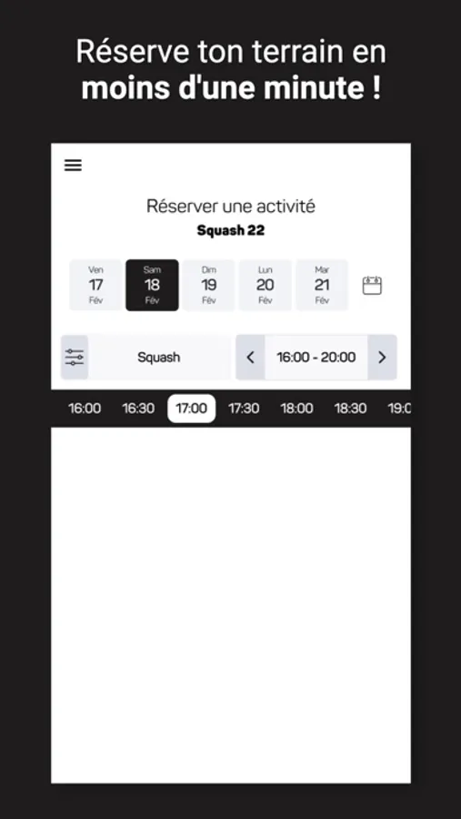 Fini la corvée de réservation ! Avec l'application tu n'as plus qu'à accéder aux créneaux disponibles et à en choisir un. Le club recevra alors automatiquement ta réservation.