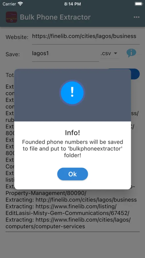 - The app saves every phone number it finds to a CSV or TXT file in real time. Even if the app is interrupted, your leads are safe.