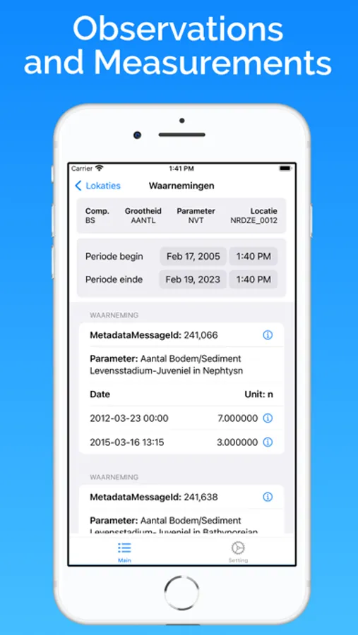 - The Observations View: The measurement screen display the results for the selected catalogue item and location. The user can set the periode the data and measurements needs to be fetched for. The resulting measurement information is tabulated and it also enables access to the metadata related to the observation and measurements.