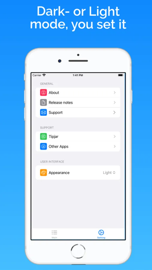 - Settings View: In the settings view more information on the App can be found. Also the display mode (dark/light/follow-system) can be set.