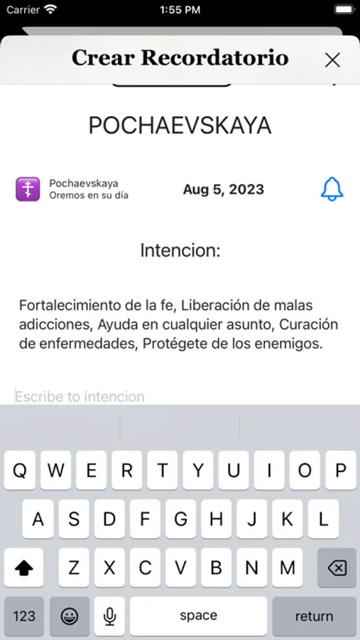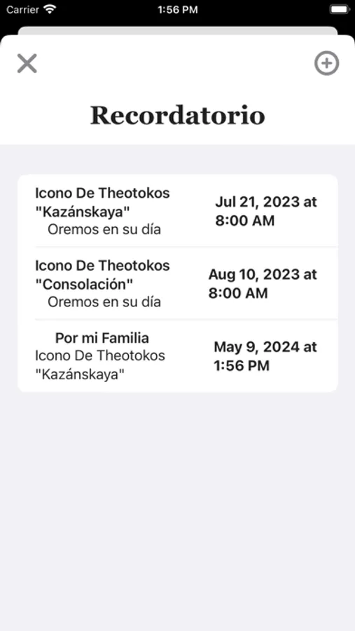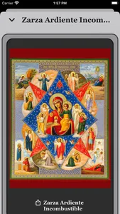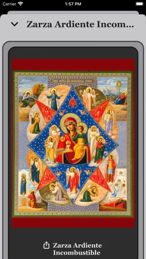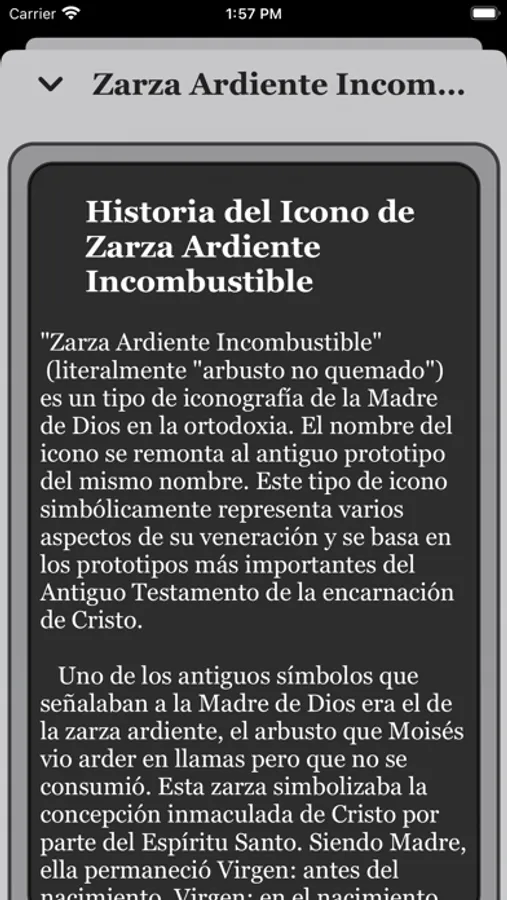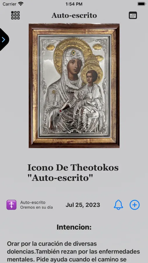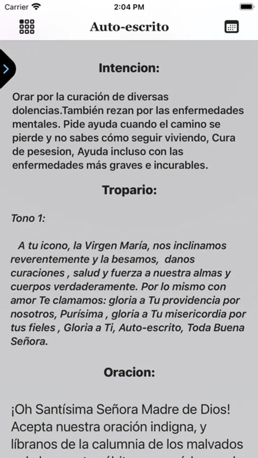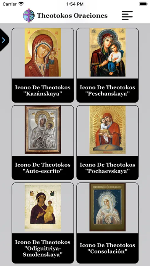 Cada icono en "Theotokos Oraciones" es representado con su imagen, titulo en español y autóctono, fecha de celebración con capacidad de crear recordatorio, y función de crear recordatorios y peticiones personales, troparion, canto, intenciones y su correspondiente oración.