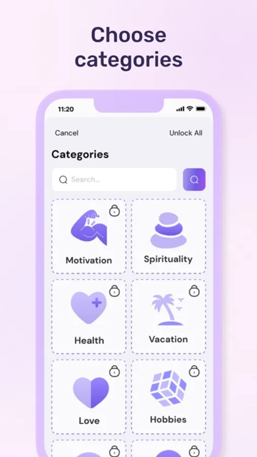 Upon opening the app, users are prompted to select from a list of categories such as anxiety, stress, self-esteem, and motivation. Once a category is selected, the app provides a list of affirmations and motivational messages tailored to that specific category. These messages are designed to help users stay positive and focused throughout the day, providing a boost of motivation when needed.