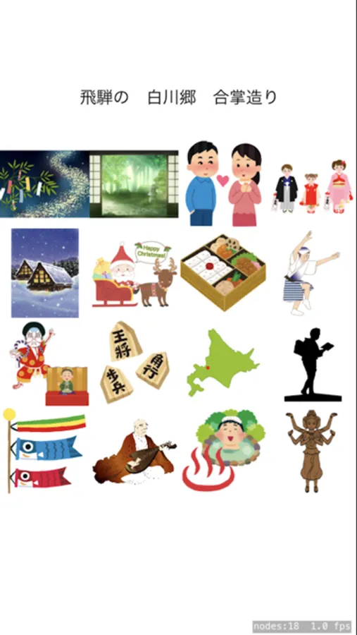 16枚の画像の取り札が並んでいます。最上段にメッセージが出ますので、適切な画像を選んでタッチして下さい。