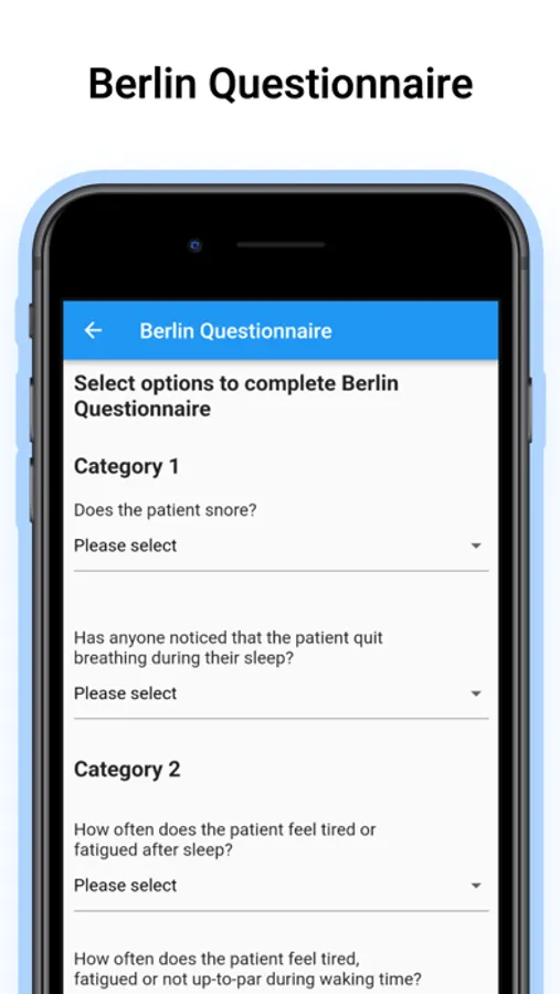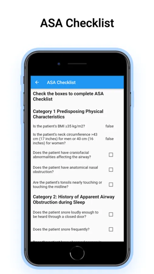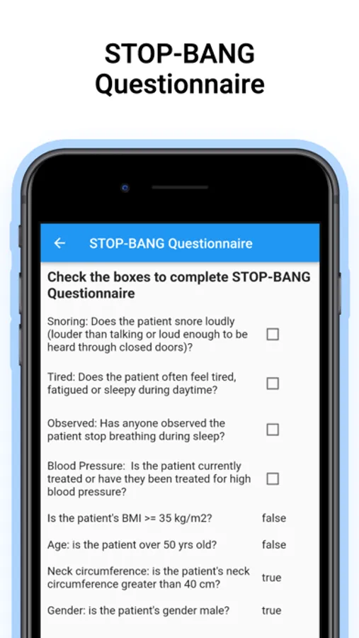 The OSA screens were sourced from peer-reviewed clinical studies as documented in the scientific/medical literature. The ASA questionnaire was implemented from: Chung, Frances et al. 'Validation of the Berlin Questionnaire and American Society of Anesthesiologists Checklist as Screening Tools for Obstructive Sleep Apnea in Surgical Patients'. Anesthesiology May 2008 - Volume 108 - Issue 5 - pp 822-830. The Berlin Questionnaire was adapted from: Chung, Frances et al. 'Validation of the Berlin Questionnaire and American Society of Anesthesiologists Checklist as Screening Tools for Obstructive Sleep Apnea in Surgical Patients'. Anesthesiology May 2008 - Volume 108 - Issue 5 - pp 822-830 and Netzer, NC et al, 'Using the Berlin Questionnaire to identify patients at risk for the sleep apnea syndrome.'' Ann Intern Med 1999; 131:485-91. The STOP models were implemented based on the work of: Chung, Frances et al. 'STOP Questionnaire: A Tool to Screen Patients for Obstructive Sleep Apnea' Anesthesiology May 2008 - Volume 108 - Issue 5 - pp 812-821.