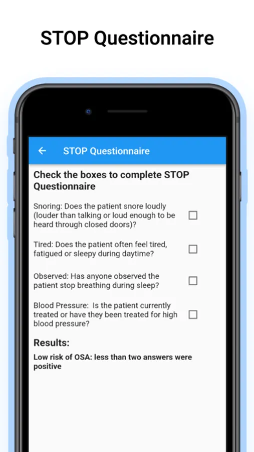 OSAS obviates the need for memorization of these tests and referral to textbooks or journals to administer the screens correctly. Users have access to these screens at their fingertips. Using these screens, the general likelihood (low or high) of a person suffering from OSA can be determined.