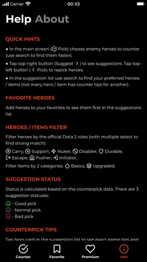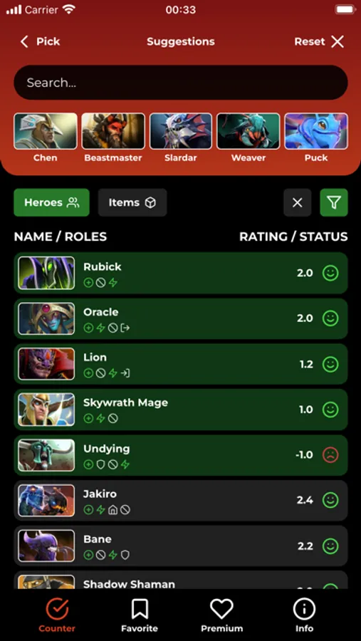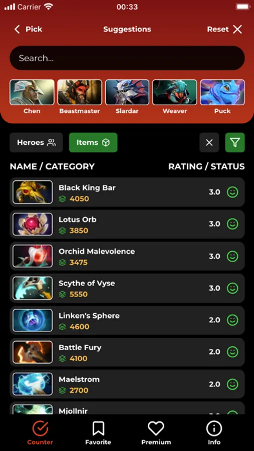 Our counterpick feature is powered by info taken from the open-source community-driven web database, Dota 2 Wiki, to provide you with the best hero / item suggestions. With a Premium subscription, you can get access to all pick suggestions for any matchup, ensuring that you always make the right picks and dominate the game.