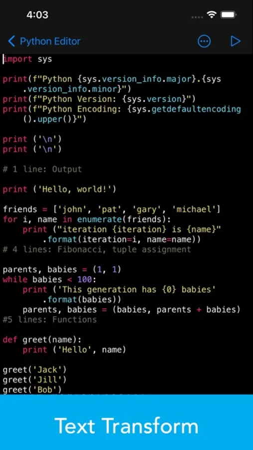 Introducing the ultimate Python editor for iOS! Our app offers a powerful and easy-to-use environment for coding in Python on your iPhone or iPad. Whether you're a beginner or an experienced developer, you'll love the intuitive interface and rich feature set that make coding a breeze.