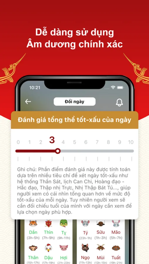 Ưu điểm so với các ứng dụng xem ngày giờ tốt xấu khác: Có chấm điểm theo từng ngày cụ thể giúp người xem có thể dễ dàng hình dung được mức độ tốt xấu của ngày. Hơn nữa ứng dụng còn cung cấp các cách xem ngày chính xác cho từng năm sinh cụ thể.