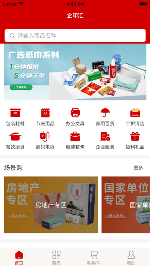 企印汇App一站式数智化采购平台,客户可以根据自己的需要去选择不同的规格以及自己所需要的商品,该APP主要包括四大板块,首页是根据大部分客户的需求而显示出来的商品,分类可以让客户快速找到自己想找到的分类,购物车是方便客户选好自己的商品快速提交订单,我的页面显示了基本信息和订单的情况。