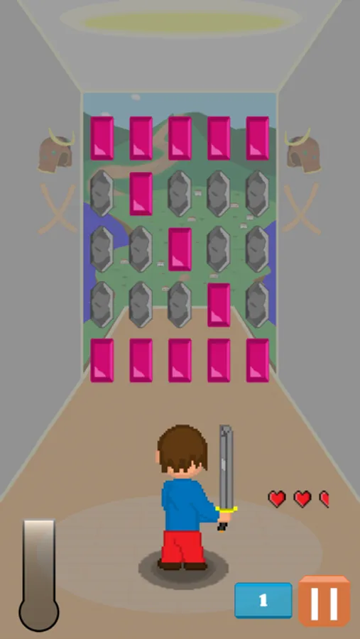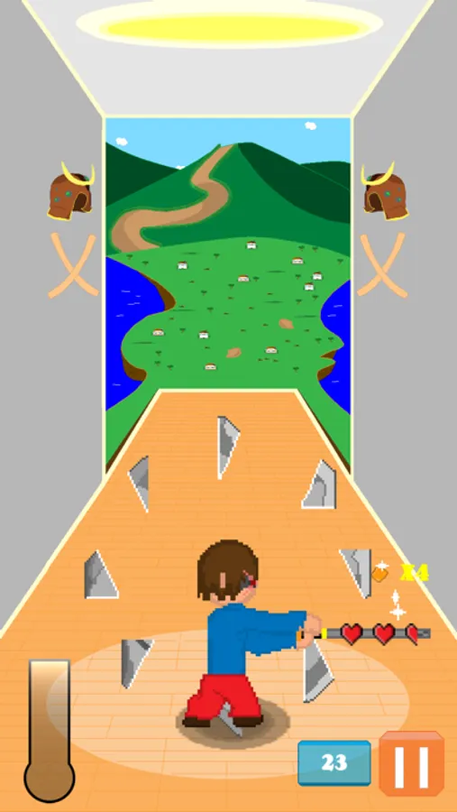 Slash, the second game mode, offers a more reactionary style of gameplay, in which the player must be quick to react to both gray blocks and pink gems that stride along the alleyway of the Dojo! Slash the pink gems and dodge the gray blocks! Similarly to Dash, the player must also be wary of various Hazardous Events, signified by a gray film, that may impede the player's progress. Unlike Dash, however, the player can only gain Meter by successfully triumphing over each Hazardous Event. Be sure to fill your meter as best as you are able, as it will allow you to perform a Super Slash! A Super Slash, if performed on a pink gem, will reward the player with 2 bars of Meter! A Super Slash may also be performed on a gray block, and will result in healing the player by 1 heart! Be mindful of the increasing pace of Slash as you progress, as it may certainly challenge your reaction time!