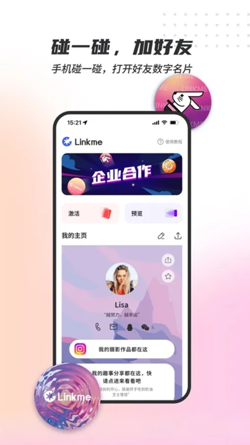 基于用手机碰一碰NFC芯片的贴纸从而查看用户数字名片的软件,通过APP激活并在APP内设置个人信息、通讯录管理、个人名片管理等功能