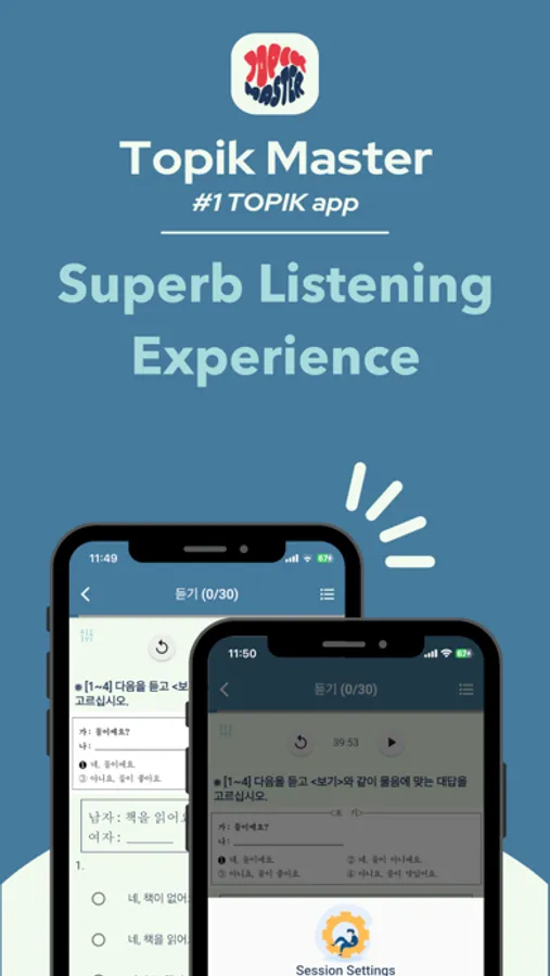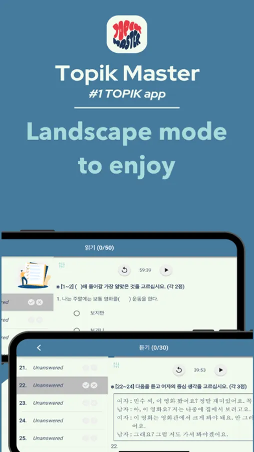 - Try each TOPIK part (듣기 • 쓰기 • 읽기) separately or check your skills with Exam Simulation