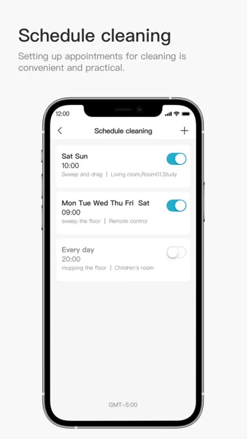 Schedule a personalized cleaning task for the robot and specify when, where and in what mode you like.