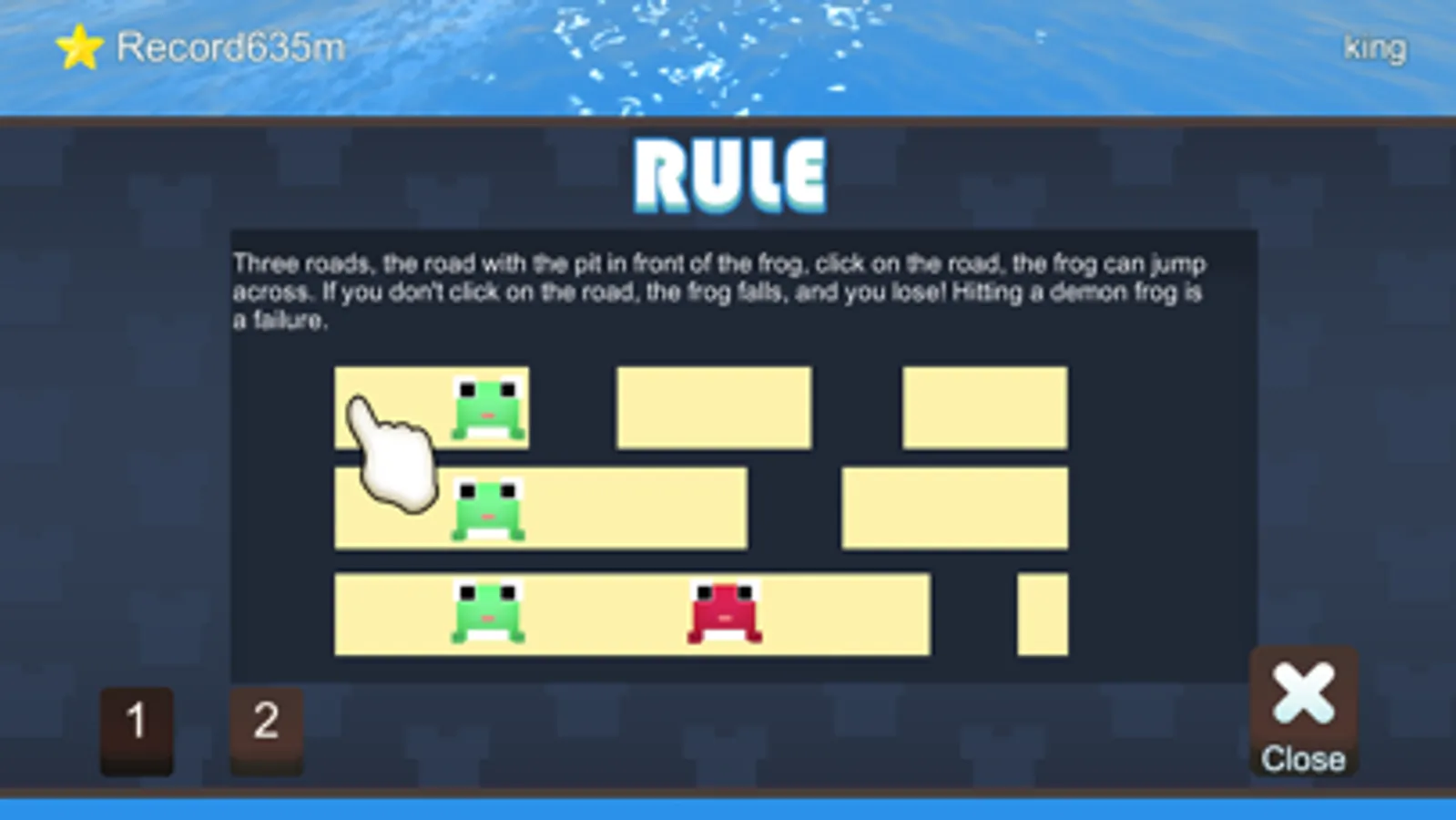 The three frogs keep moving forward, and there will be pits on the road. Players need to click on the road with pits, and the frogs will jump over it. If you don't click on the road, the frog will fall, and you will lose!