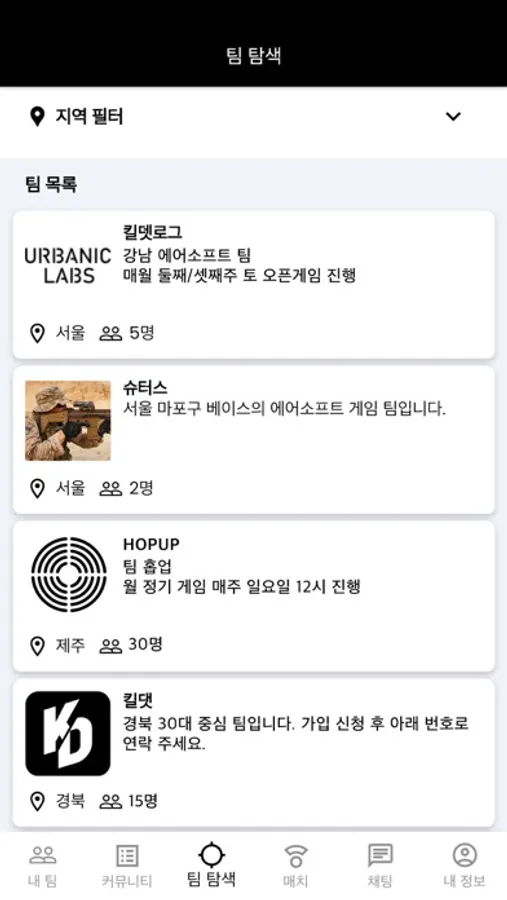각 지역별로 등록된 팀을 찾고 쉽게 가입 신청할 수 있습니다.