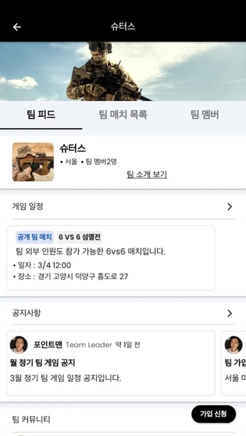 팀 게임 일정을 등록하면 팀 피드에 노출되어 게임 일정이 확인 가능함은 물론 참가 인원 등록이 가능해 게임별 인원 관리도 가능합니다.