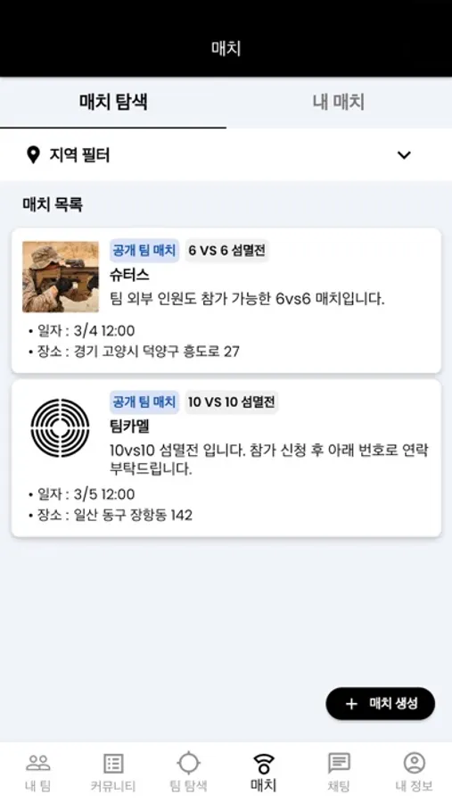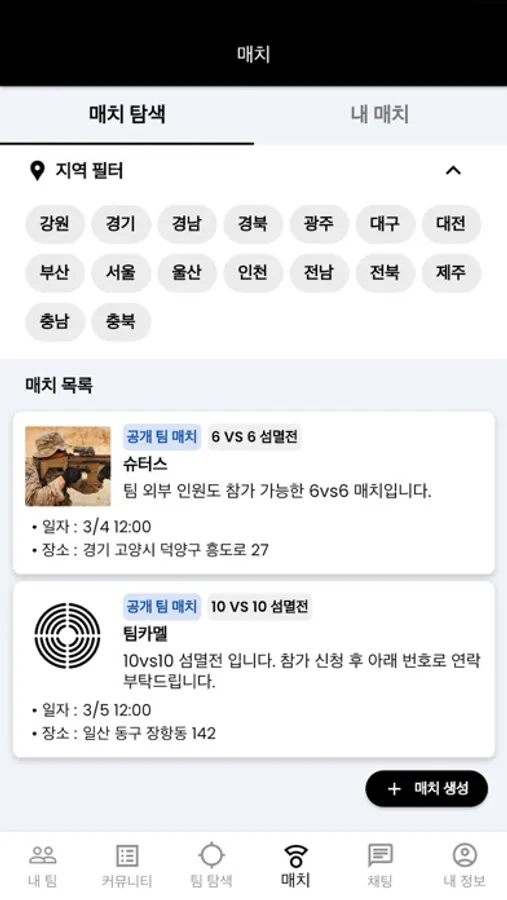 게임을 뛰고 싶어도 팀이 없어서, 인원이 부족해서 힘드셨죠? 매칭 기능을 이용해 지금 참가 가능한 게임을 찾아보세요.