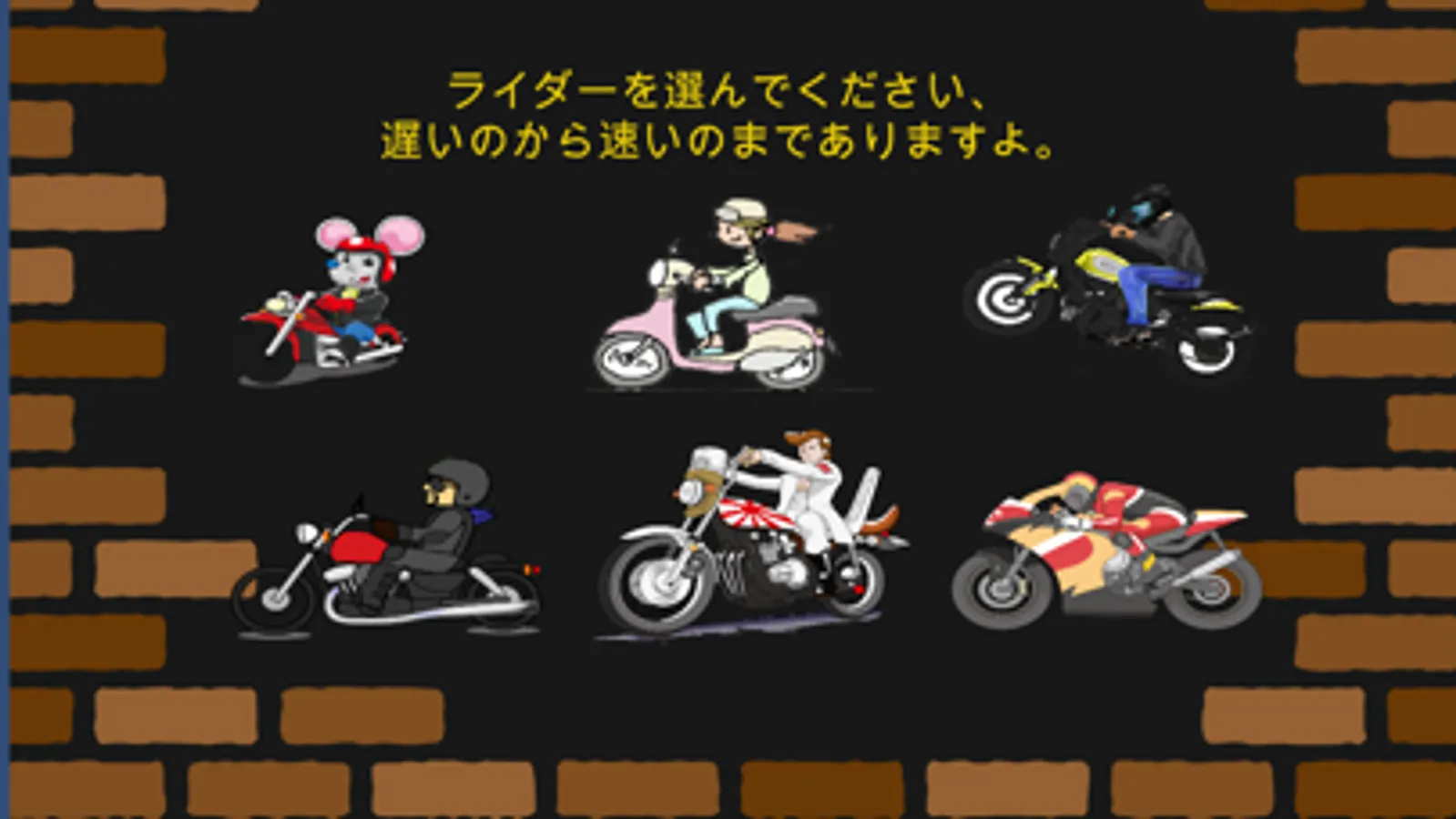 2、6台のバイク(キャラクター)を選べます。各バイクは速さが違います。