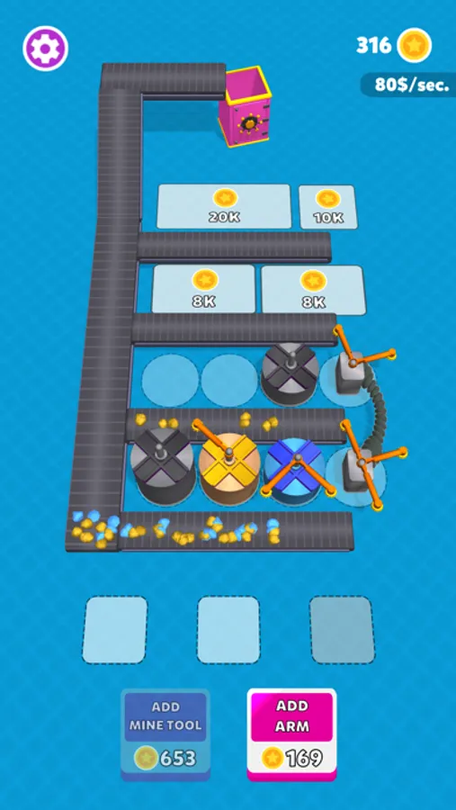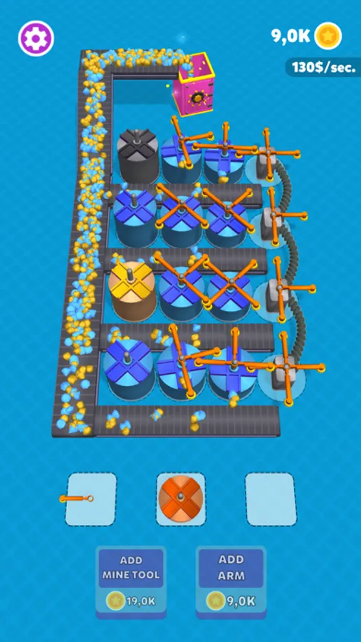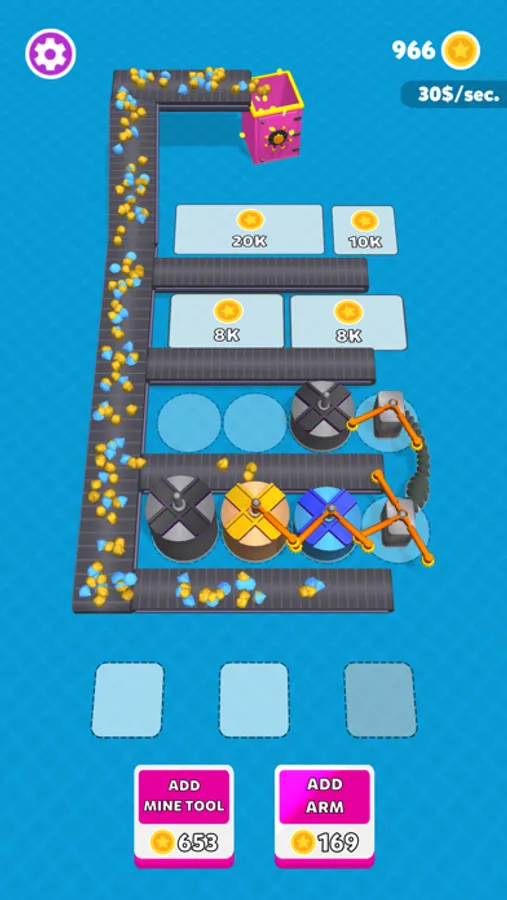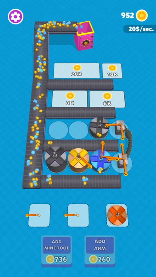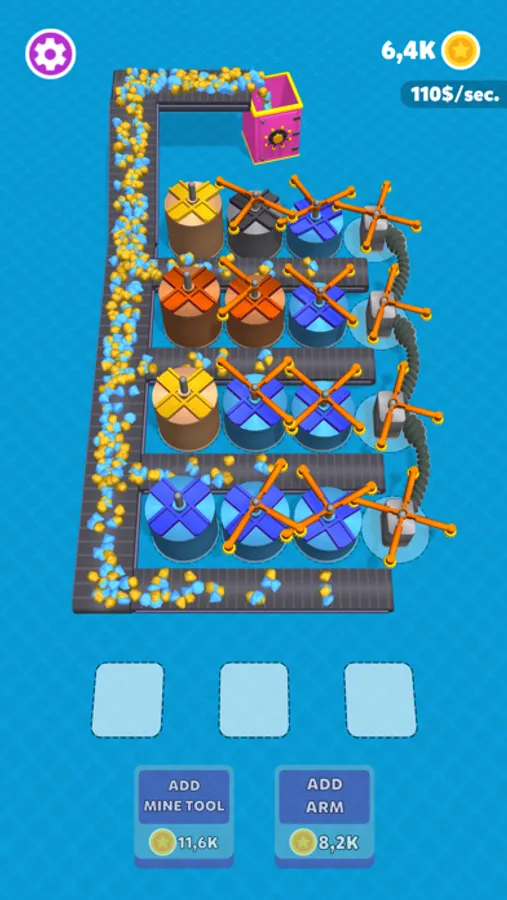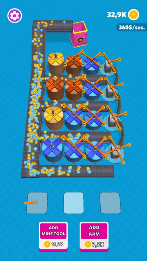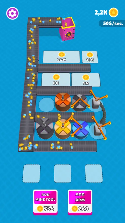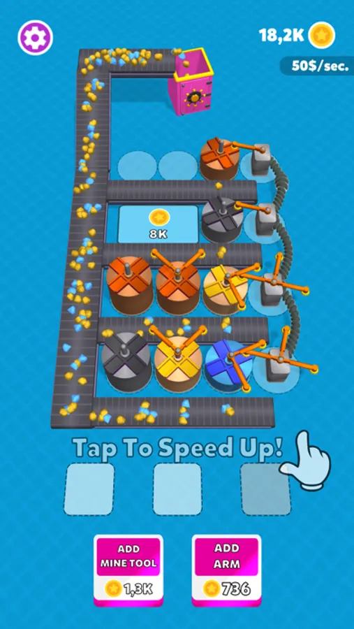 Add more mine tool and arm, improve the system and earn more! The gears are spinning! Every click is money! Click more to earn more gold and diamonds!