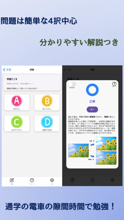 ・4択中心の問題で、通学途中など隙間時間にサクサク勉強できる