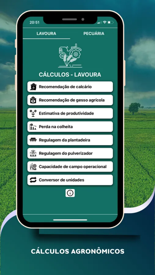 A calculadora agrícola é uma solução completa e intuitiva para auxiliar profissionais da área agrícola em seus cálculos diários. Com dois módulos de cálculos para lavoura e pecuária, contendo mais de 30 cálculos. Este aplicativo oferece diversas funcionalidades para tornar as tarefas matemáticas mais simples e eficientes.