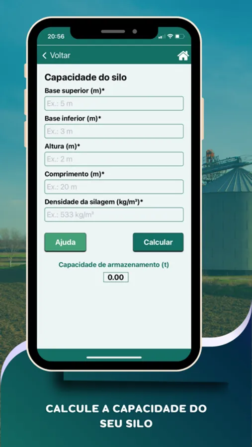 • Capacidade de silo: permite calcular a capacidade de armazenamento do silo.