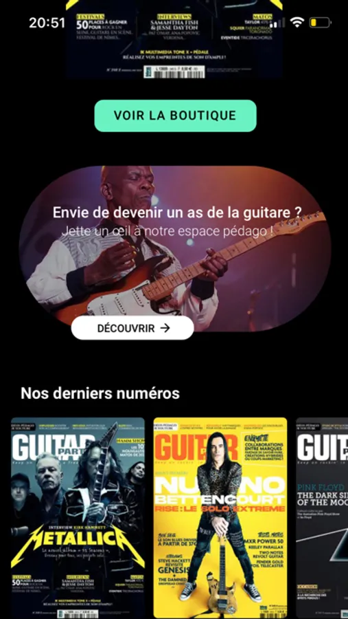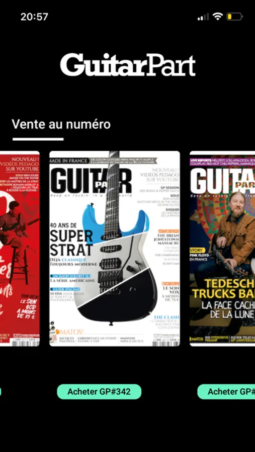 L'application vous permet actuellement d'acheter en version numerique les anciens numeros de Guitar Part qui est la reference des musiciens a 6, 7 ou 8 cordes depuis pres de 30 ans. Chaque mois, le magazine s'adresse aux passionnes en rencontrant les artistes qui font le buzz et en decouvrant des nouveautes matos : guitares, effets, amplis, accessoires, home studio... Le cahier de partitions propose une serie de lecons thematiques pour tous les styles blues, rock, jazz, metal et tous les niveaux. Nous prevoyons de la faire evoluer vers : L'acces aux videos pedagogiques et aux partitions. La capacite de le recevoir en papier chez vous. De vous abonner en numerique comme en papier. Et bien plus encore.