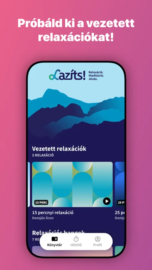 Használd a “Lazíts!” app ingyenes funkcióit és hanganyagait! A könyvtár teljes tartalmához, az összes háttérhanghoz való hozzáféréshez fizess elő! Próbáld ki az alkalmazás teljes tartalmát ingyenesen egy hónapig!