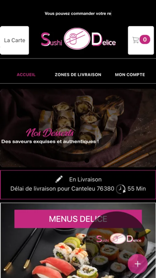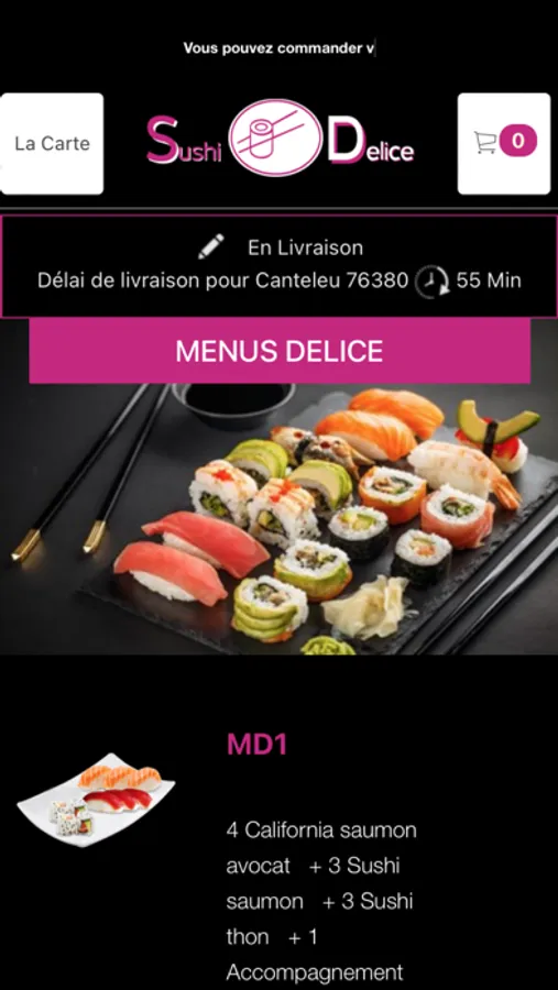 L'application Sushi Delice vous permet de commander en ligne ou par téléphone via votre application. Vous pouvez consulter notre carte et choisir vos produits.