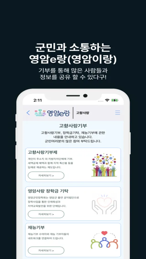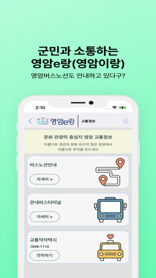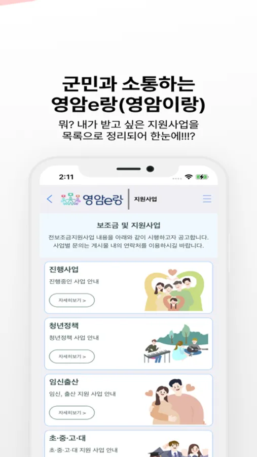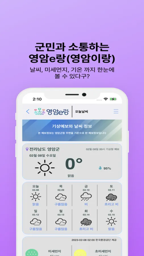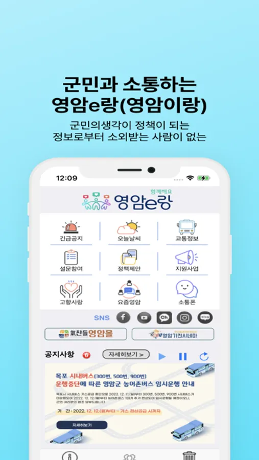 영암e랑은 날씨부터, 긴급공지, 보조금 및 지원사업, 버스노선표, 정책제안, 설문조사, 요즘영암 등을 제공합니다.