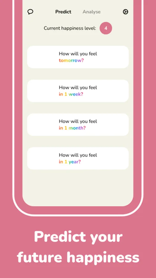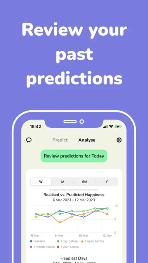 With HappySteps, you can rate your happiness on a daily basis, predict your future happiness, and visualize a graph of realized vs. predicted happiness.