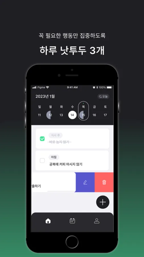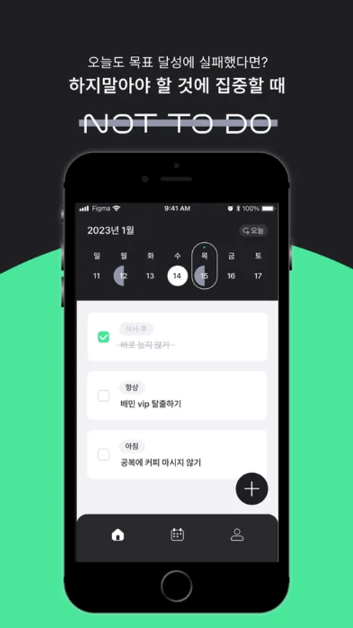 지나치게 많은 계획은 오히려 달성을 방해해요. 오늘 하루 꼭 실천할 낫투두만 등록하고, 목표 달성 방해요인을 차단하는 데에 집중해보세요.