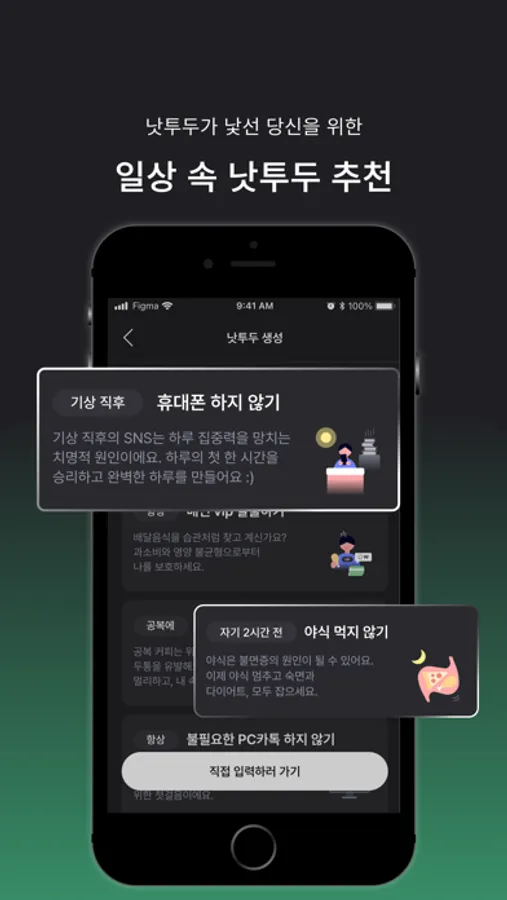 낫투두를 쉽게 시작할 수 있도록, 생활 속 유용한 낫투두를 미리 준비해두었어요. 금주, 스크린타임 제한, 루틴 만들기, 나쁜 습관 개선 낫투두와 함께하면 가능해요.